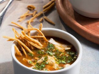 Consomé con una crepa rellena de pollo y vegetales / Consommé with a crepe filled with chicken and vegetables